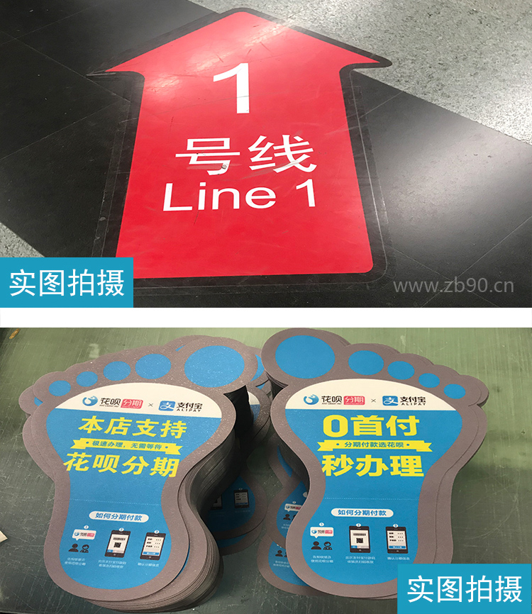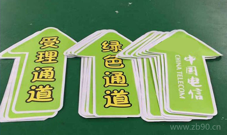 地贴主要使用车身贴做为粘贴层,使用户外写真机喷绘画面,再在车贴上面覆一层防滑地贴膜,经过裁剪制作完成。也有使用背胶制作的,使用背胶制作,虽然成本低廉,但背胶在附着力,延展性和易揭易撕方面均不如车贴。