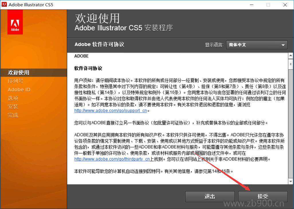 6.选择安装目录默认安装目录在C:Program Files (x86)Adobe(建议安装在除C盘以外的磁盘中,可在D盘新建一个文件夹AICS5)