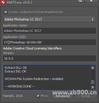 10. 注册机右下角有个Install,点击它会出现让你找一个dll文件,这时候应选择刚才安装的目录,路径前面也提到过是:C:Program FilesAdobeAdobe Photoshop CC 2017找到后选择软件根目录下的amtlib.dll 接着点“打开”。